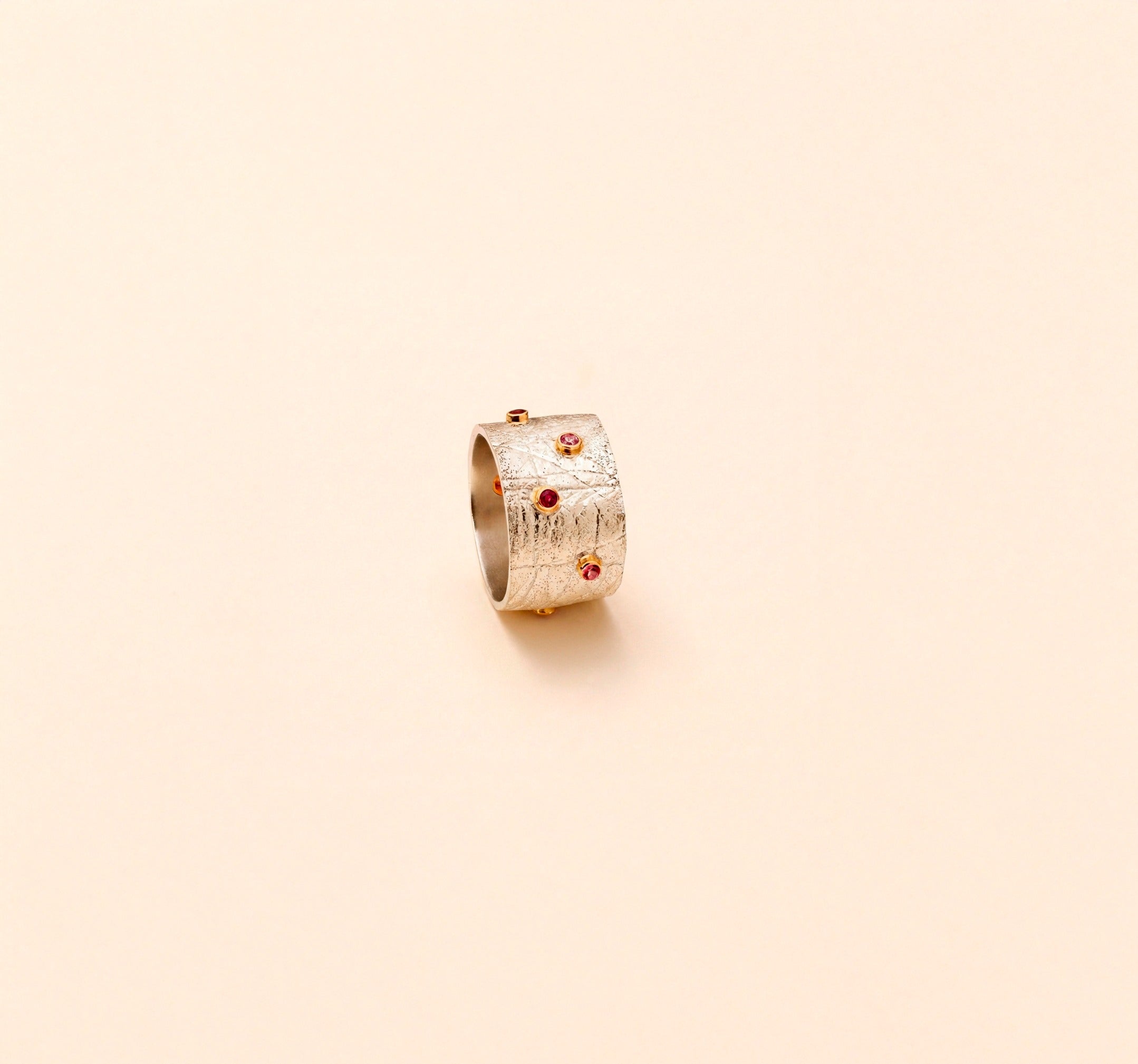 Bague anneau façonnée avec l'empreinte d'un être cher, sertis clos en or, tourmalines